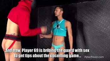 The Guard (Nolan Knox) has made a secret deal to tell Player 69 (Dane Jaxson) what's coming next in the SexPig Games, in exchange for a clandestine hookup of hot, dirty sex. Lucky for both young Asian studs the next game is "Evens or Odds" with a set of marbles, and the clever Guard is coaching Player 69 in a very seXXXy way. Brandishing a set of anal beads, he will insert a number of them up 69's hungry hole and have him guess even or odd. After a couple tries, 69 gets it wrong EVERY time. (Or does the Guard just tell him he fucked up?)