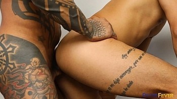 Damian yanks Tanner's boxers and jock to jack their dicks together. Once he's had his taste of Tanner's thick tool, he leads him downstairs and inside. Tanner puts on knee up on a folding chair and spreads his ass open for Damian to get a lick. Taking Damian's finger with a satisfied groan, he braces against the wall and Damian plows in raw. Fucking close, tight and sweaty, things heat up rapidly. Damian sits on the chair as Tanner straddles and sits on his big cock. He leans in for a deep kiss. Damian has to pull out, ready to blast his load. He sprays his sperm down Tanner's smooth asscheeks.