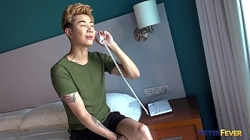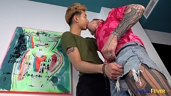 After some introductory deep kisses, Robert guides Nolan's hand down to his swelling crotch. And VOILA! Robert's naked and showing all his beautiful head to toe tats, and Nolan's worshipping him the way a good gay boy can, taking his cock deep down his thirsty gullet. He bends Nolan over ass-up on a sleek polished table and eases his massive cock all the way in. What follows is a juicy, balls-deep screw that has Nolan finally getting the relief and relaxxxation he's been lacking. Not that Robert isn't enjoying every second plowing Nolan's hungry Asian-American fuckhole.He takes a seat and lets Nolan grind his ass onto a big European sausage, courtesy of the resort. Nolan sprays his wad down his nuts as Robert drills in harder and faster. The customer always cums first, and Robert wishes him a good night and wanders out, still stark naked.