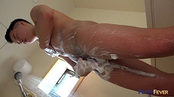 Once this handsome twentysomething gets inside, he strips for his shower. Standing naked in an Asian-style bathroom with drain in the floor, he uses a brisk hand shower to shoot those warm jets against his smooth bronzed body. One hand reaches up to pet the downy hair of Reitaro's armpits, then the camera pans down to watch little bubbles of soapy foam collect in the smooth crack between his firm round ass cheeks. He soaps up his crotch, the foam covering his soft pubes like snow drifts. As he perches a foot on the bathtub's ledge, a finger or two drills into his squeaky-clean hole. The other hand starts stroking his wet, hard cock.