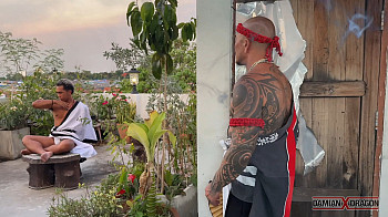 Scene One - Exiled and scarred, Sha Wujing bears the weight of centuries — once a proud general of Heaven, now a fallen warrior marked by shame and solitude, every muscle and scar a reminder of his past. The river reflects his tension, the sunlight tracing the lines of his body, every shadow igniting a hunger he dares not admit. And yet, there is Tai Shang Lao Jun, the Daoist monk ageless, commanding, and impossibly calm, focusing at the edge of the building like a living temptation. His eyes, soft yet insistent, meet Wujing’s with the understanding of someone who has watched him struggle, someone who knows the fire hidden beneath the warrior’s stoic exterior.