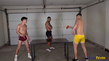 Strict table tennis coach Jon Darra is watching Rosebudov sparring against hot new player Kai, and getting a few crotch grabs in while he coaches. Neither player is having a stellar day, and they retire to the quarters they share. Jon almost catches the two top players making out on Kai's bed, but warns them to get enough rest for competition NOW! As soon as they pretend to drift off, Darra creeps in and rouses Kai. Once he's done feigning being tired, he notices Jon's big tasty dick and starts nursing on it.