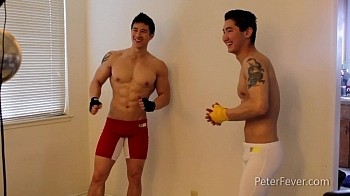 Peter has done it again. He's found another gorgeous Asian stud and coaxed him into the studio for a photo session. Meet Jake Moore. Jake is a straight ripped mixed martial arts master who's originally from Mongolia. He's a little shy at first but Peter gets him loosened up by joining him in front of the camera. After playing around and taking some photos that pretend to have them going at it in combat, Peter gives a few tips on working out and how to build more muscle. After that, Jake is off to the races and as he gets more comfortable in front of the camera, his dick comes out for some air and the real photo session begins. Jake is a natural and after a nice long stint in front of the camera, he hits the shower to show off even more.