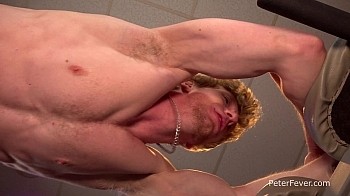Jesse gets down on all fours, ready to get his pumped-up booty plowed by the trainer. Jon slides his raw cock in smooth and deep. He grabs both Jesse's butt cheeks and drills in balls deep while Jesse groans in ecstasy. "Oooh, FUCK, yeahhhh!" he moans to Jon. Jesse straddles Jon and does some pelvic thrusts and grinds on that stiff cock. Jon stands behind and rams in faster as Jesse braces on the bench. The blond twink can't take any more and milks out a thick splatter that dots the floor below. Jon jerks his load out on Jesse's hot tight ass.