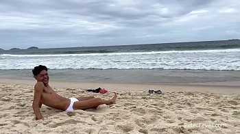 Sprawled across a sofa, Hanry rubs a palm across the bulge in his white bikini. His big uncut meat pops out of the waistband, and his heavy nuts soon droop out of the bottom of his swimsuit. Stroking, his meat swells up even larger and his head rolls back dreamily. He turns over and seductively runs a wet finger over the pucker of his tan ass. He jerks his cock between his legs, looking back to admire the skin rolling back over the thick head. As he gets close, Hanry bites his lip and groans. His tight abs tense up and he closes his big brown eyes. A creamy white splatter shoots out as he pants to catch a breath. Looking into the camera, he flashes a pearly smile and bids us goodbye.