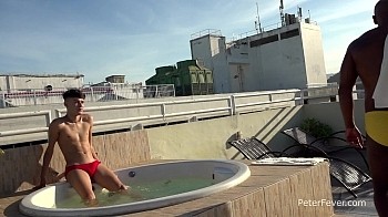 Up on the roof with Rio's iconic Christ the Redeemer statue glaring down from Sugarloaf, Hanry relaxes in an afternoon hot tub. Ebony Latin stud Vitor Guedes stretches out in an adjacent lounge, checking out the bulge in Hanry's teeny bikini. Hanry shields his eyes from the tropical sun to catch a glimpse of Vitor tugging his tool. He steps out of the tub to take Vitor's mahogany monster out of his yellow briefs and swallow it whole. Straddling Vitor's muscular chest, Hanry gets his ass eaten while he sucks. They stand to stroke their cocks together.