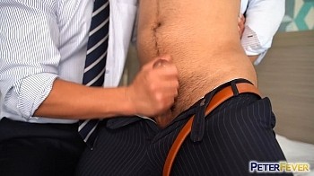 Rio gets kissed, nips tweaked, and dick and ass played with till he can't hold back a second longer. Once he's finally given up and let his nuts spew their juicy splatter, Hiroya fingers and fucks him for his own jollies. It's a scorching hot scene made even sexxxier with both guys in proper business dress. Watch out Hiroya, or you'll have to explain cum stains on the tails of your white shirt when you get back to work!