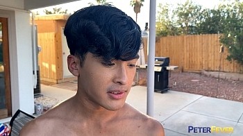 Next day for horny Kai and his porn star dreams, and it's the big Asian pool party. The host introduces his handsome Latin friend, twink pornboi Matteo Gomez, and Kai wastes no time swapping tongues with the hot little stud. The host is a little miffed. "What am I? A chopped liver?" he groans, but Matteo and Kai are already going at some heavy petting and making out. Matteo dives a hand into Kai's swim jams and before you know it they're naked on the patio couch.