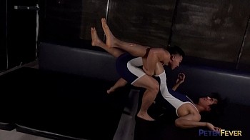 Sunny drops to his knees to pay oral homage to Jay's big hard cock. His tongue darts down to lick the wrestler's sweat-dripping nuts. Jay peels down Sunny's singlet and lays him back on the mat, slurping his teammate's own thick tool. As Sunny rolls over with a groan, Jay burrows his sex-starved face into Sunny's smooth ass. He rises to kneel between his buddy's spread legs and slides his bare cock in deep. Sunny climbs up to straddle Jay's powerful thighs and grind his hole onto the sexy Asian stud's fucktool. He wraps his furry legs around Jay's narrow hips as the wrestler drills in balls deep. When things heat up to the boiling point, Jay has to stop thrusting to pull out, spraying a sticky wad across Sunny's tight belly. "So much cuuuummm!" Sunny bellows as Jay strokes his buddy's cock to a creamy splatter.